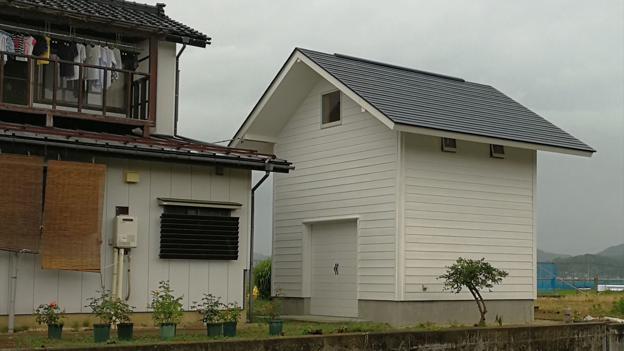 HOME | 施工事例 | その他建築物 | その他:燕市M邸 2階でくつろげる小屋 燕市 M様邸 【外観】奥様が物置と2階で趣味室として使いたいと言うご要望でした。外観はおしゃれな北欧イメージで外壁を白に統一し、屋根も青い爽やかなイメージです。 【外観】鎧張りになっている外壁は色が違うだけで洋風にも和風にもなります。両側の妻両面には高断熱サッシを設置して排熱もバッチリです。 【外観ー工事中ー】こちらは工事中の外観です。天然の杉板を貼ると和風とも取れます。ファサードラタンと呼ばれる外壁の張り方にすると、この色でも洋風になるので奥様と最後まで悩み、白に塗装することにしました。 【外観】出入り口は使いやすい引き分け式の引き戸です。1間(約1.8m)すべて開放できるので、自転車や農機具などを入れるのに楽々入れられます。 【工事中の内観】いつもの住宅でしたら高気密住宅を作る際に、気密シートを施工しますが今回は基本に忠実な袋入りグラスウールを使って壁面と屋根断熱をしています。屋根はしっかりと通気を取り普通の住宅と同じ仕様になっています。流石に最近の高気密・高断熱住宅より性能は低いのですが、それでも省エネルギー基準をクリアしている性能です。冬場は小さなストーブ一つで約12畳の部屋を温めることが出来ます。 社長・専務挨拶 各種募集事項 ブログ FAQ お問い合わせ